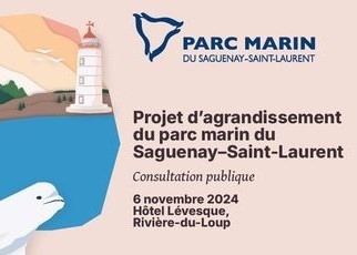 Venez assister à l’événement de participation publique sur le projet d’agrandissement du parc marin du Saguenay–Saint-Laurent.Cette soirée se tiendra à l’Hôtel Lévesque de Rivière-du-Loup, le 6 novembre 2024. Notre équipe sera présente pour vous rencontrer et répondre à vos questions.Bienvenue à tous et à toutes, aucune inscription n’est requise!Au programme :- 16 h : kiosques animés […]