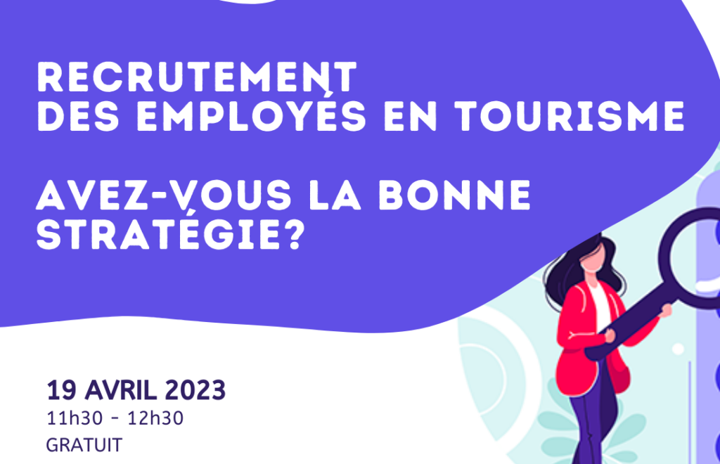 MERCREDI 19 avril 2023. WEBINAIRE : RECRUTEMENT DES EMPLOYÉS EN TOURISME: AVEZ-VOUS LA BONNE STRATÉGIE? REVOIR LA PRÉSENTATION PPT La pénurie de main-d’œuvre entraine des conséquences importantes sur nos opérations et suscite aussi plusieurs remises en question de nos pratiques RH. Dans un contexte où la traditionnelle question « pourquoi vous […]