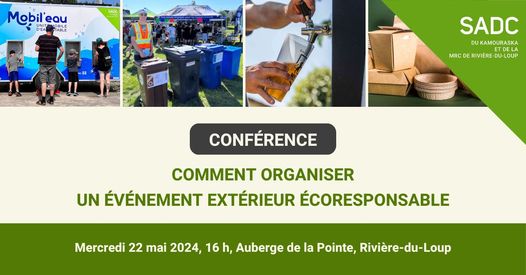 Les SADC du Kamouraska et de la MRC de Rivière-du-Loup vous invitent à une conférence portant sur l’organisation d’un événement extérieur écoresponsable dans le cadre du lancement de la saison 2024 du projet Mobil’eau, qui sera présentée à deux reprises :
