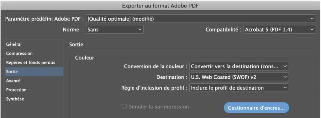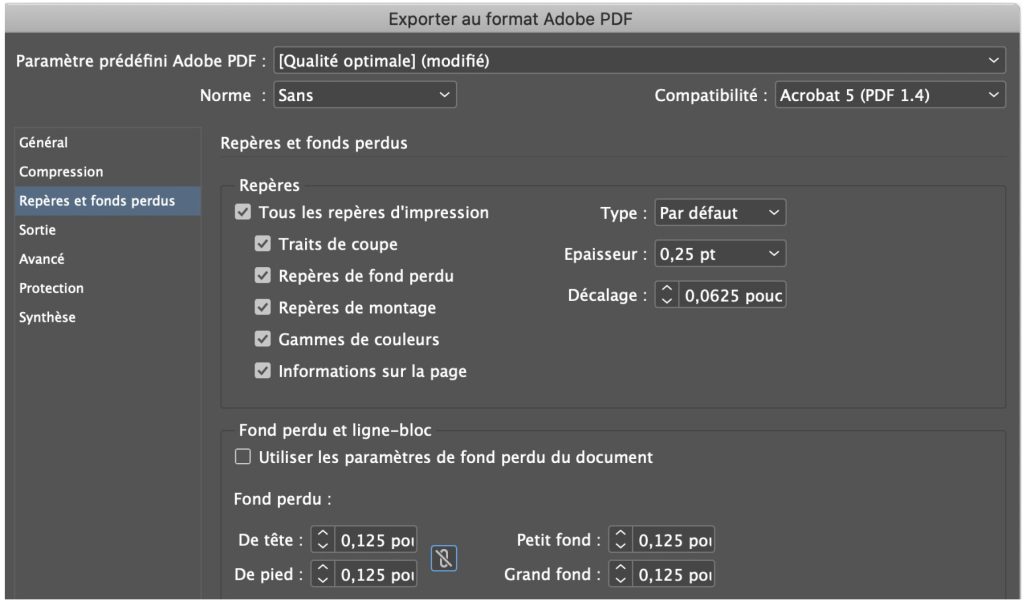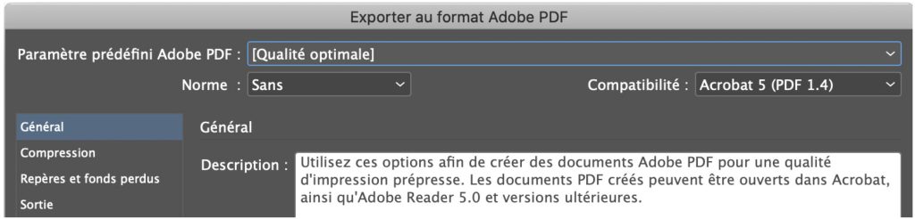 Sélectionner les options de sauvegarde dans les fenêtres à l’exportation du PDF, pour l’optimisation de l’imprimé de la publicité dans le guide.